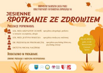 Już w najbliższy piątek, 3 października, o godz. 17:00, w hali Skarszewskiego Centrum Sportu rozpocznie się Jesienne Spotkanie ze Zdrowiem. Burmistrz Skarszew Jacek Pauli oraz partnerzy wydarzenia serdecznie zapraszają na to wyjątkowe spotkanie poświęcone zdrowiu! W programie prelekcje prowadz…